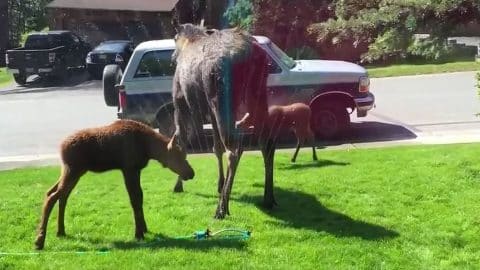 Baby Moose In Sprinkler